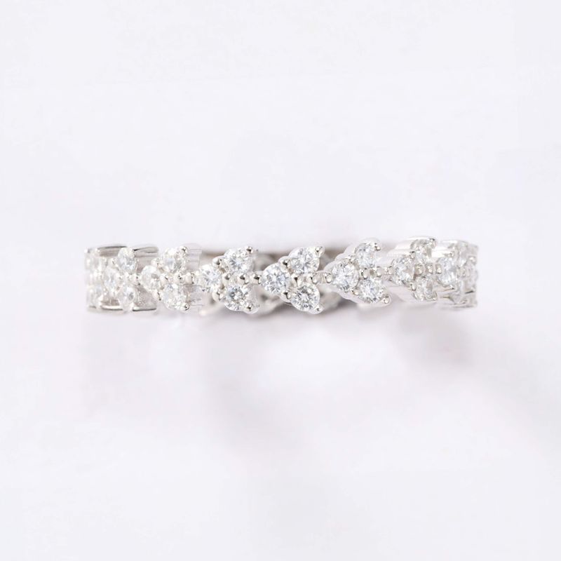 Anillo elaborado a mano en plata 925, con cristales facetados que rodean toda la circunferencia. Su diseño continuo refleja una luz sutil y elegante en cada movimiento. Una pieza encantadora, perfecta para celebrar el amor
