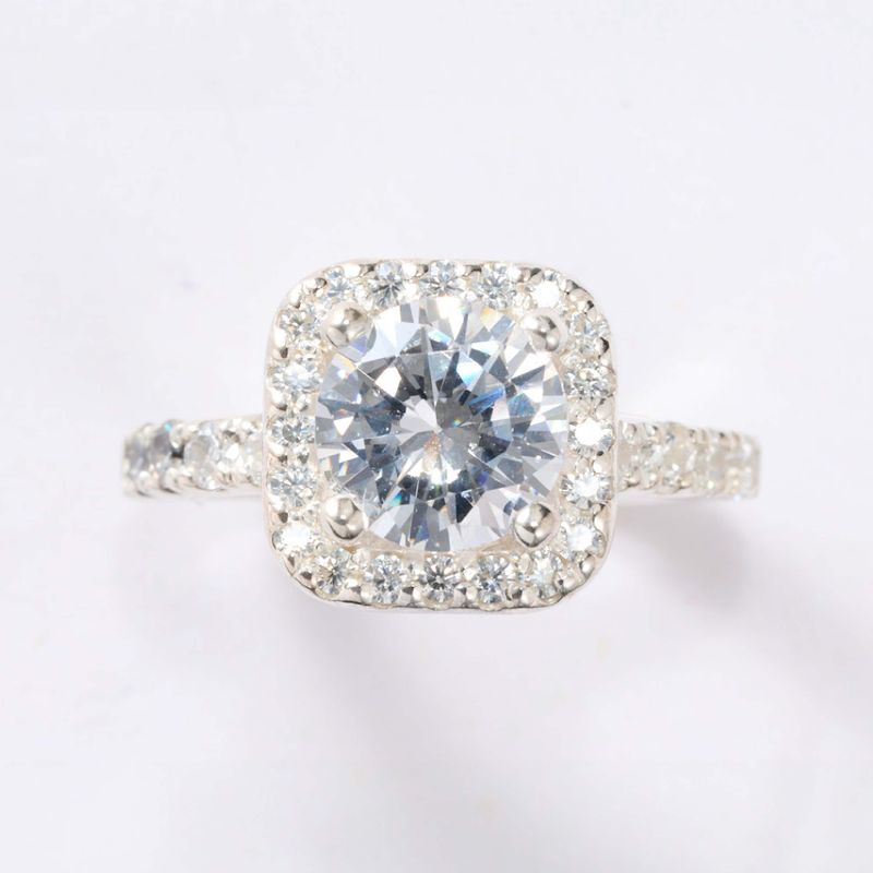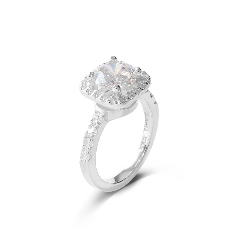 Anillo de compromiso elaborado a mano en plata 925, con un cristal central en montura elevada, rodeado por un halo de pequeños cristales facetados que intensifican su resplandor. El aro engastado completa el diseño con destellos continuos y delicados. Una joya de brillo envolvente y carácter atemporal.