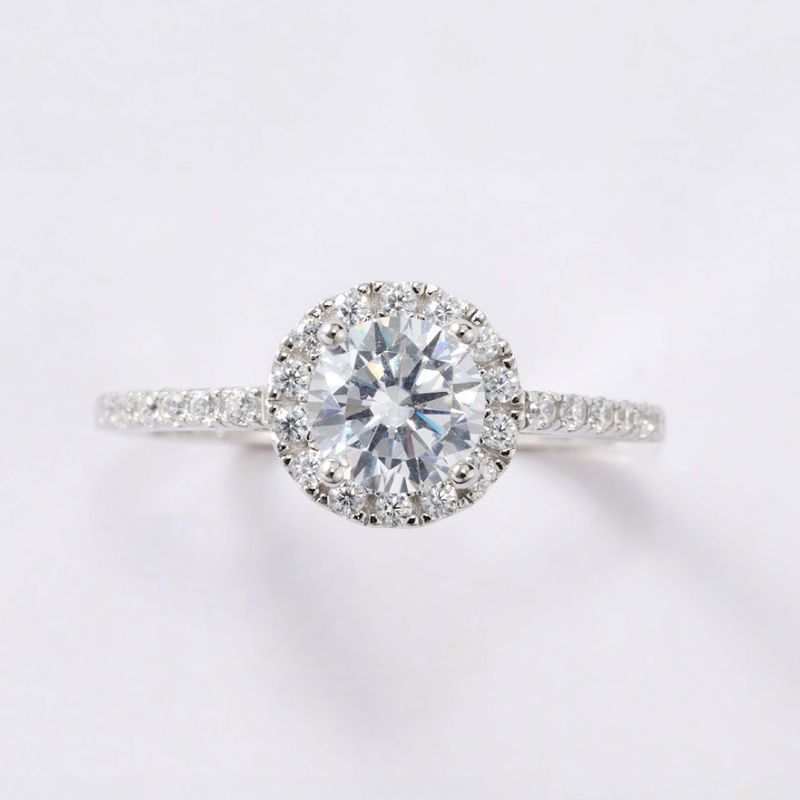 Anillo de compromiso elaborado a mano en plata 925, con un cristal central redondo en montura elevada, rodeado por un halo de pequeños cristales facetados que acentúan su brillo. El aro engastado completa el diseño con una luz sutil y continua. Una pieza que celebra la elegancia con un destello clásico y encantador.