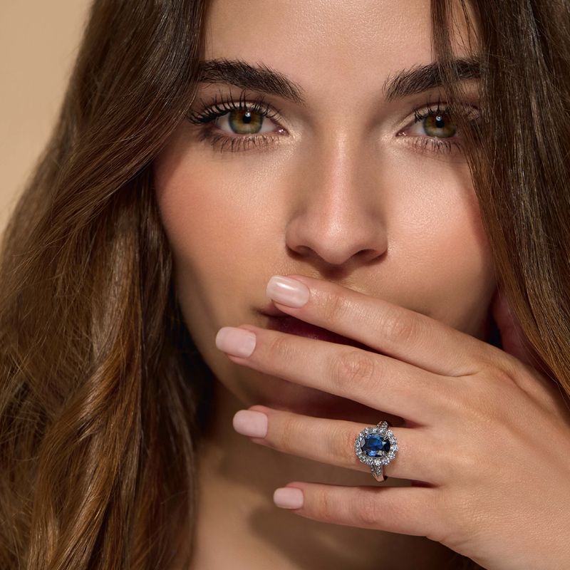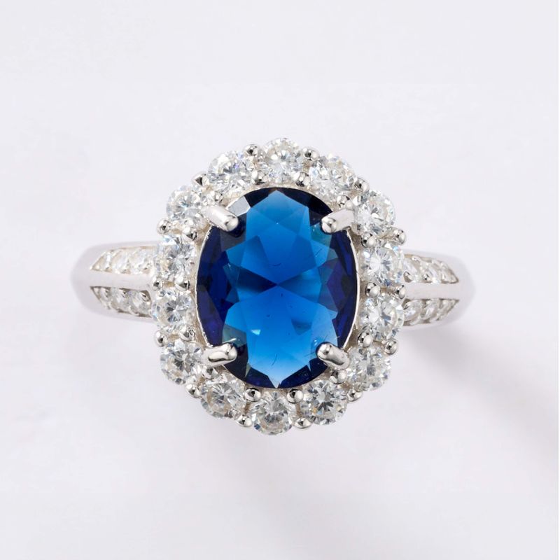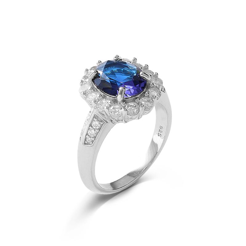 Anillo de compromiso hecho a mano en plata 925, con cristal central de tono azul rodeada por una corona de cristales que aportan brillo y elegancia. Su diseño de inspiración clásica destaca por su presencia imponente, ideal para momentos inolvidables.