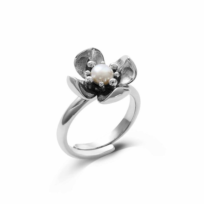 Anillo regulable elaborado a mano en plata 925 con diseño de flor y perla.