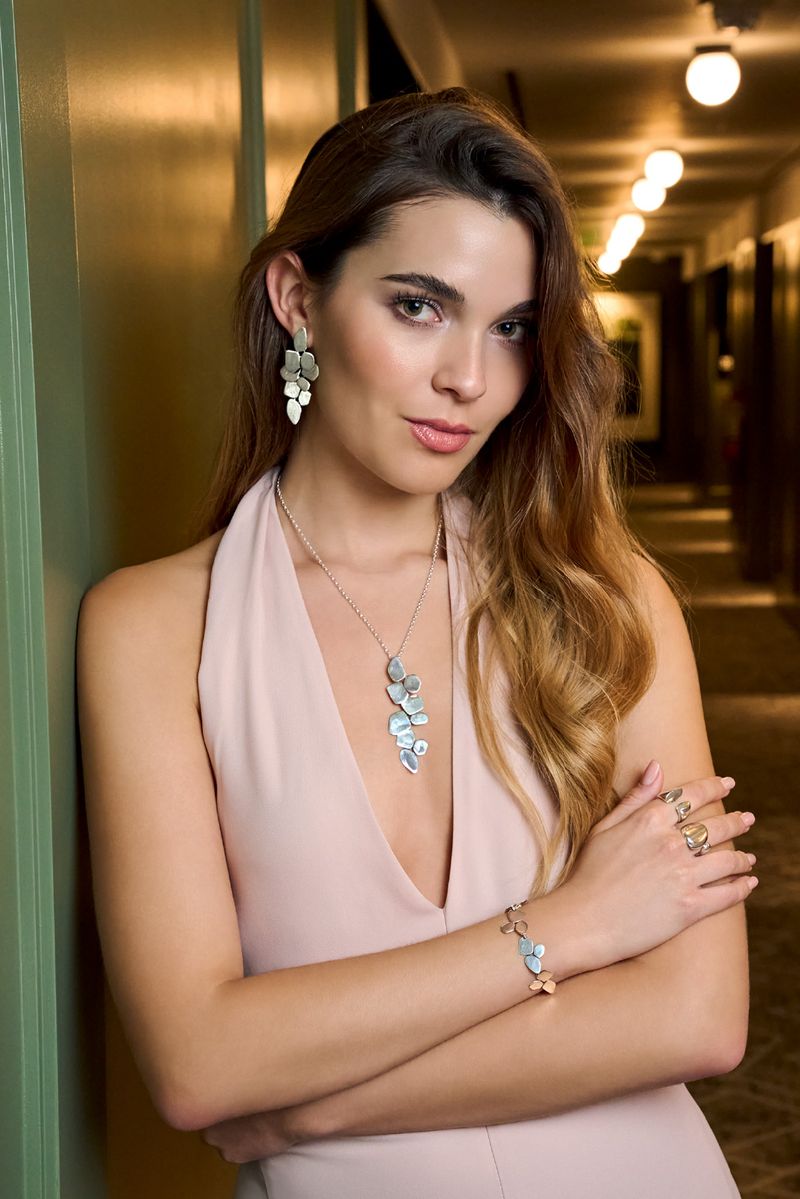 Collar elaborado a mano en plata 925, con dije largo de piezas superpuestas con acabado liso y satinado.