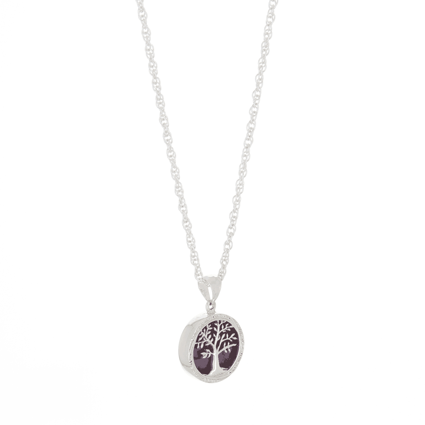 Collar vida, hecho a mano en plata 925 con dije del árbol de la vida sobre círculo de amatista tallada.
