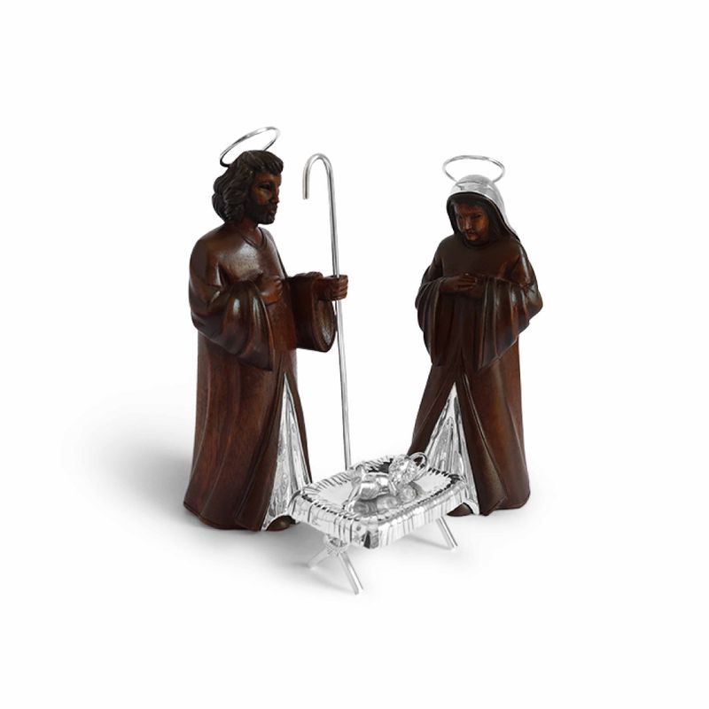 Tallas de José y María elaboradas a mano en caoba con aplicaciones en plata 925. El precio es solo por la talla de José y María, el pesebre con el niño se vende por separado. Imagen referencial.