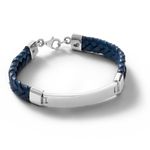 Pulsera hecha a mano en cuero italiano trenzado de color azul y placa lisa en plata 925.