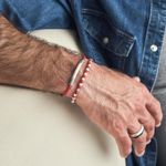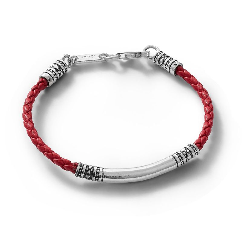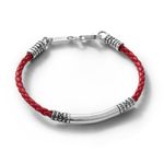 Pulsera hecha a mano en cuero italiano trenzado de color rojo y plata 925 con diseño texturizado.